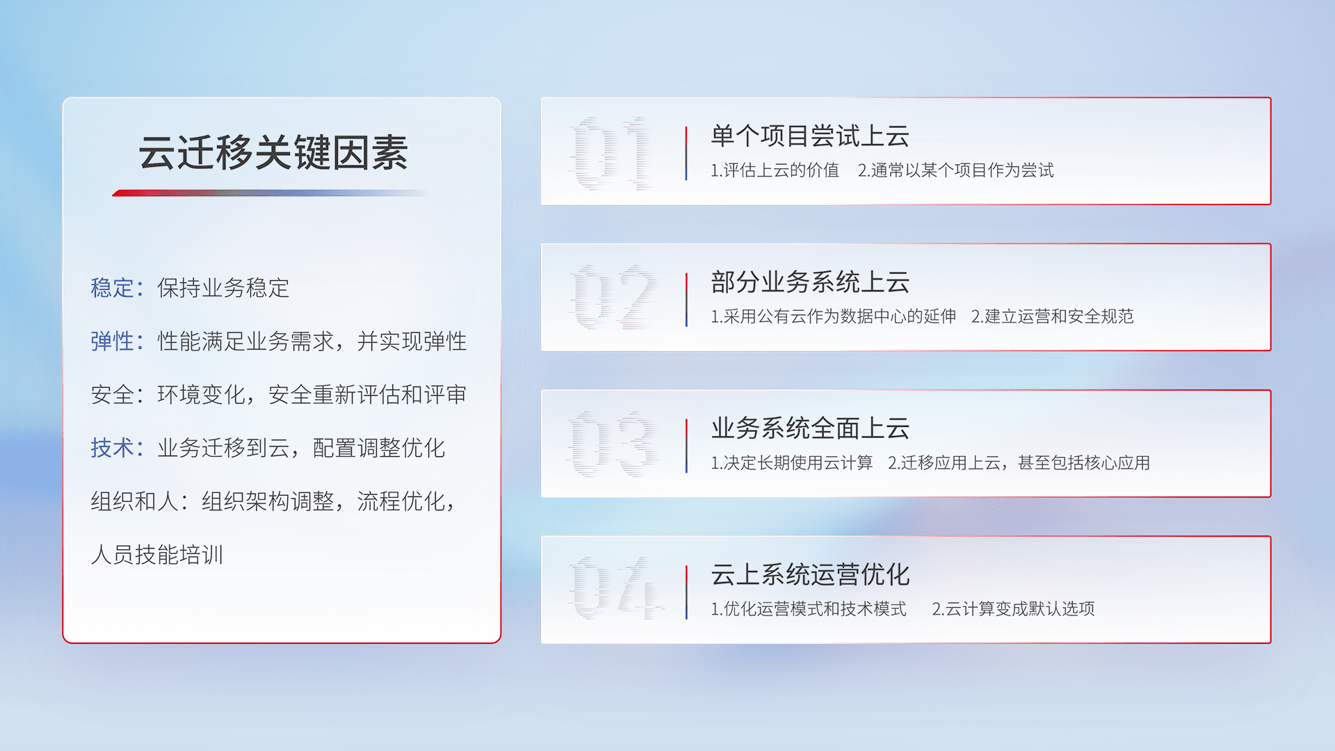 结合实际业务,,,,从规划设计、、、云平台选型、、云原生改造、、数据迁移、、、集成交付,,,,迁移全过程为客户识别最佳上云路径,,,,做好风险识别管理,,,设计网络架构、、、身份权限、、安全审计合规、、操作审计、、、、日志审计、、监控告警策略、、、多站点容灾设计等,,,对云上基础设施进行整体规划,,提升IT治理水平,,,,以满足弹性、、高可用、、高性能的需求。。。