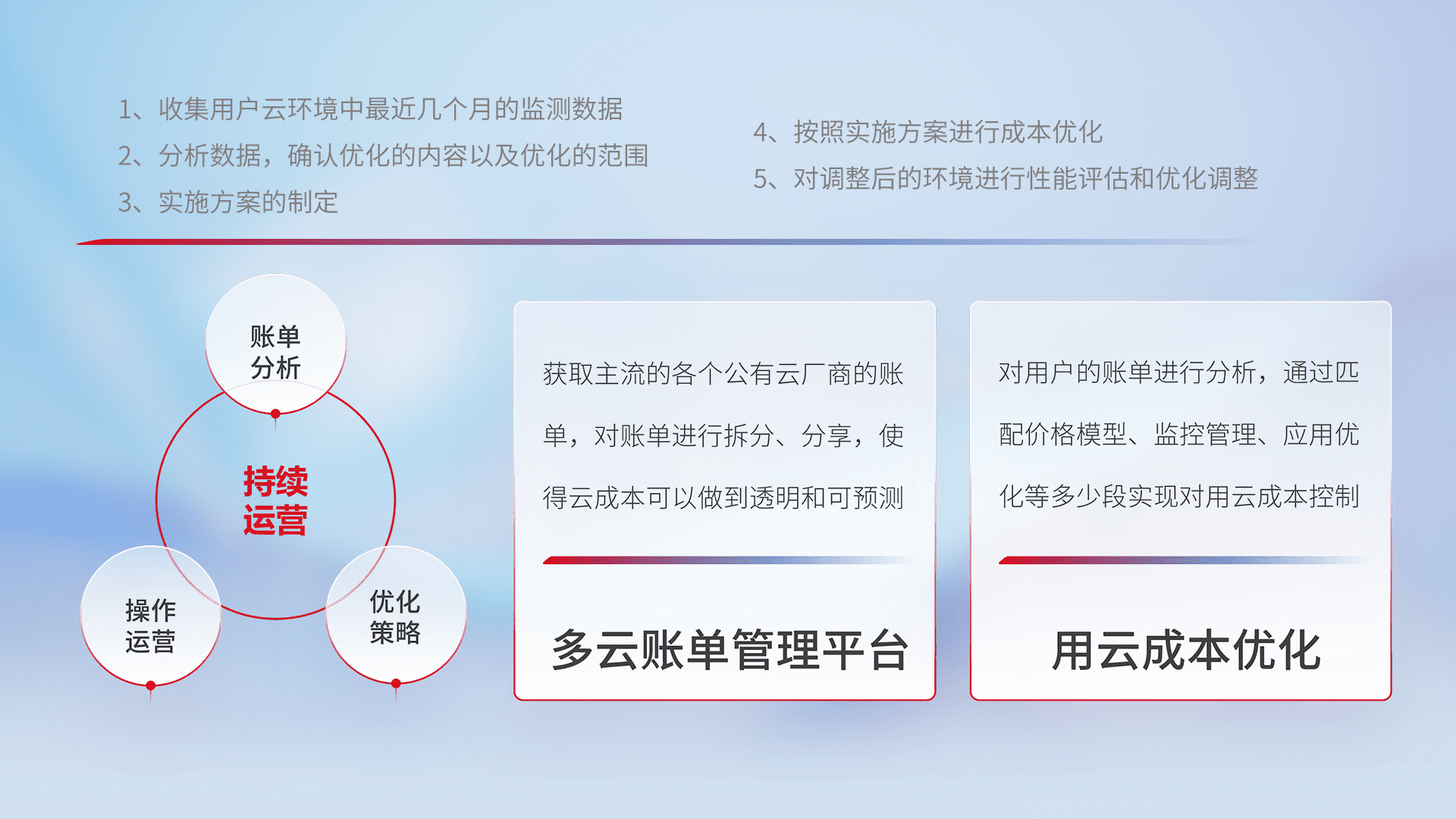 通过多云纳管,,以统一的资源数据模型把客户的云资源进行抽象和封装,,,进而实现对多云资源的统一操作,,,保障云资源管理的可靠性、、、、稳定性与可用性。。。量身定制化运维内容,,,配置、、、开发运维、、补丁管理、、、备份、、、监控、、、、认证和访问管理、、、、审计和日常巡检等,,,,保障在用云过程中的可靠度,,,,稳定度以及高可用率。。