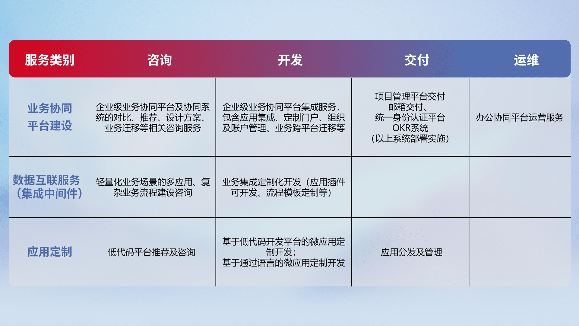 针对钉钉、、企微、、、、IDaas等平台级产品提供产品的规划、、、方案、、交付、、、定制化开发等服务,,,,实现如统一协同办公、、、智能客户服务、、混合会议管理、、、、智能数据查询、、等业务场景,,实现数字化转型。。